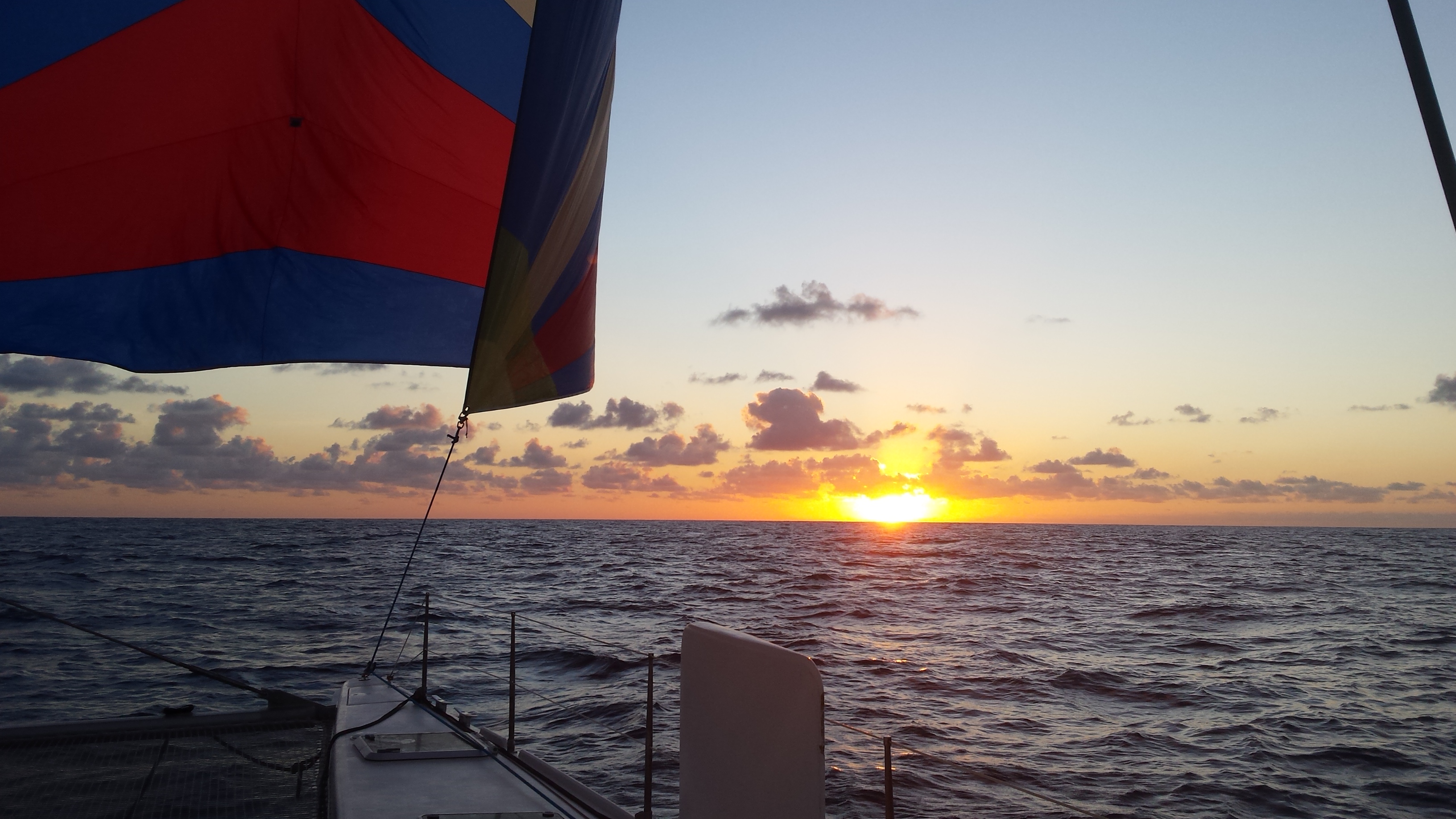Rejs z biegiem czasu zaczyna dłużyć nam się niemiłosiernie. Każdy dzień wygląda tak samo jak poprzedni. Jesteśmy zamknięci na jakiś 30 metrach kwadratowych, a dookoła jest tylko woda. Po tylu dniach nie ma już nawet zbytnio o czym rozmawiać, więc jak tylko nadarza się okazja, kładziemy się spać albo czytamy książki, żeby nie zwariować. Na dodatek pomimo małej odległości od Salvadoru, rejs zaczyna sie wydłużać jeszcze bardziej, ze względu na bardzo słaby wiatr wiejący na domiar złego zza pleców, przez co musimy co jakiś czas taklować. Tym razem jednak kapitan Sergio jest nad wyraz spokojny, co jest prawdopodobnie zasługą obecności na pokładzie jego młodszego o dwa lata brata. Wspomagamy się także specjalnym żaglem do tylnich słabych wiatrów – genakerem, który poza tym, że trochę nas przyśpiesza, ozdabia nasz katamaran swoimi pastelowymi kolorami. Zachody słońca wyglądają przy nim naprawdę bajecznie.