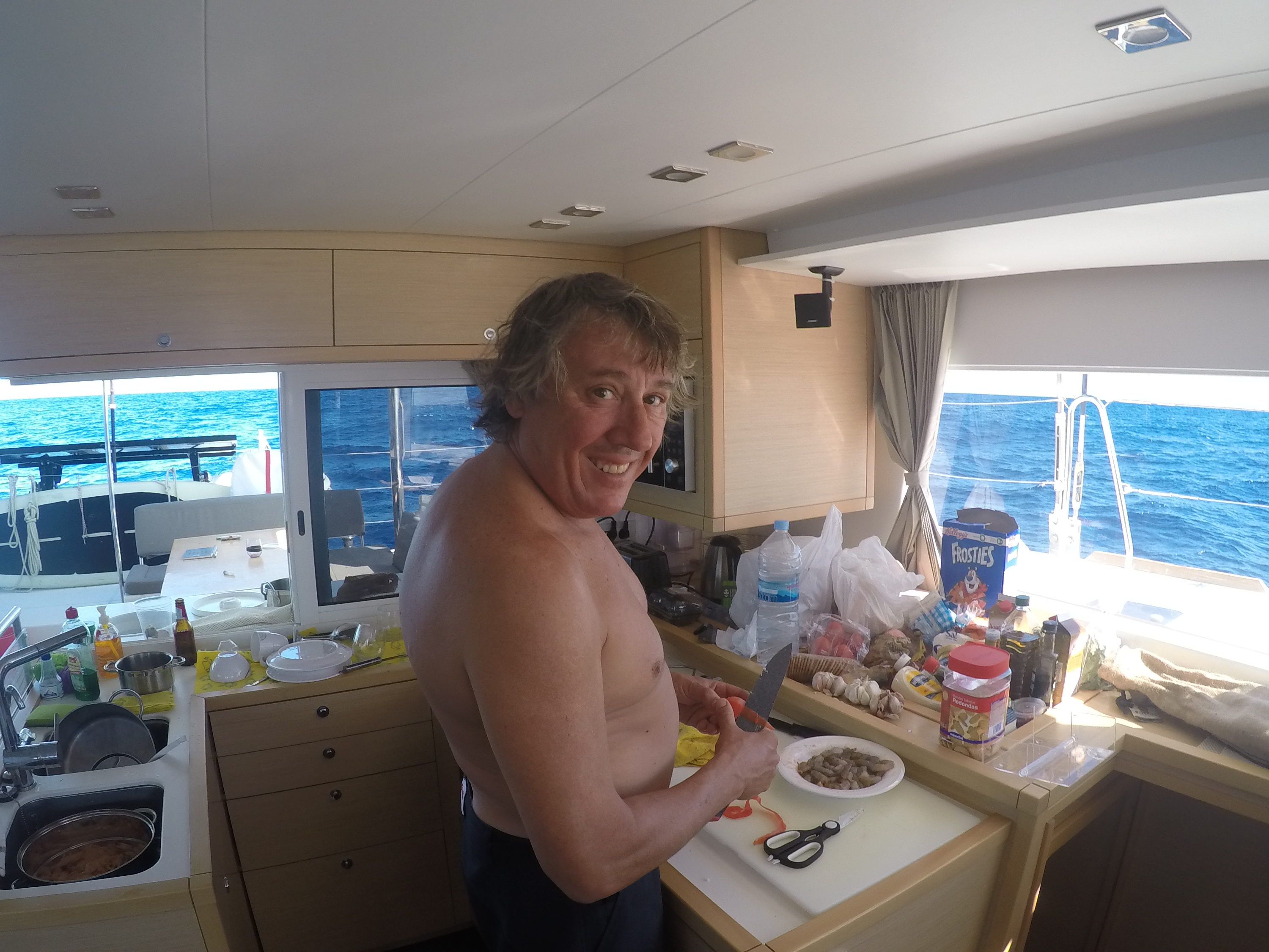 Już drugiej nocy złapał nas sztorm! Zaczął się koło 3-ciej w nocy i trwał do rana, ale kapitan koło 5-tej powiedzial nam żebyśmy poszli spać, bo i tak im się nie przydamy:P. A nie było w tym nic dziwnego, gdyż obaj byli kapitanami od 20stu lat i z takim bagażem doświadczenia, żółtodzioby jak my tylko zawadzaliśmy podczas gdy oni wykorzystywali warunki (wiatr ponad 30 węzłów, a deszcz na tyle mocny że nie dało się oczu otworzyć). Bujało niesamowicie, ale dla nich to nie było zbyt dużą przeszkodą.