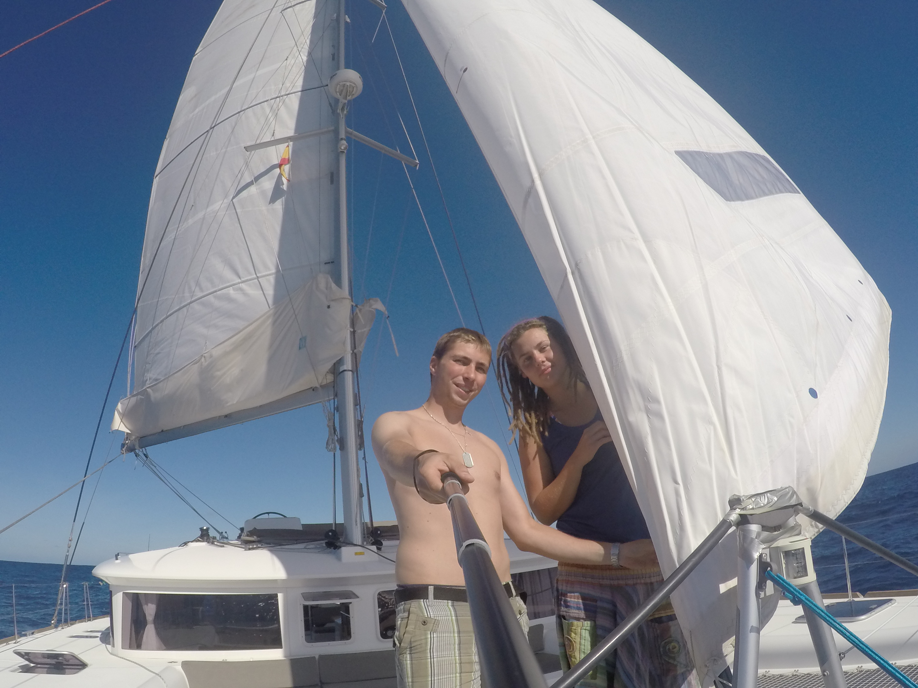 Jedną z takich osób była Kasia, która okazała się przesympatyczną towarzyszką podróży. A zaczęło się od tego, że siedzieliśmy na ławce w marinie pijąc piwko i szykując się powoli do winka, gdy podjechało dwóch hiszpanów. Zaproponowali nam piwo w zamian za pomoc z przeniesieniem zakupów na ich łajbę. Propozycja była nie do odrzucenia, więc nie zastanawialiśmy się zbyt długo, a ich łajba okazała się być ślicznym katamaranem! Jak usłyszeli naszą historię, postanowili nas zaprosić kolejnego dnia i oznajmić nam wspaniałą nowiną, że możemy płynąć z nimi na wyspy Kanaryjskie!(oni też kiedyś tak podróżowali).