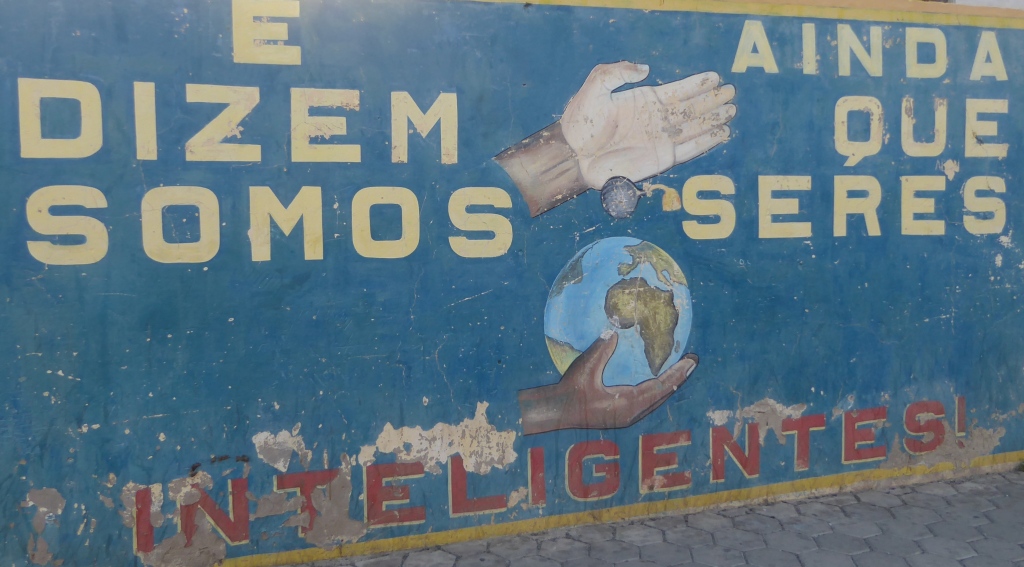 Czarna dłoń trzyma Ziemię, podczas gdy biała zrzuca na nią bombę – czyli streetart w Wyspo-Zielono-Przylądkowym stylu.