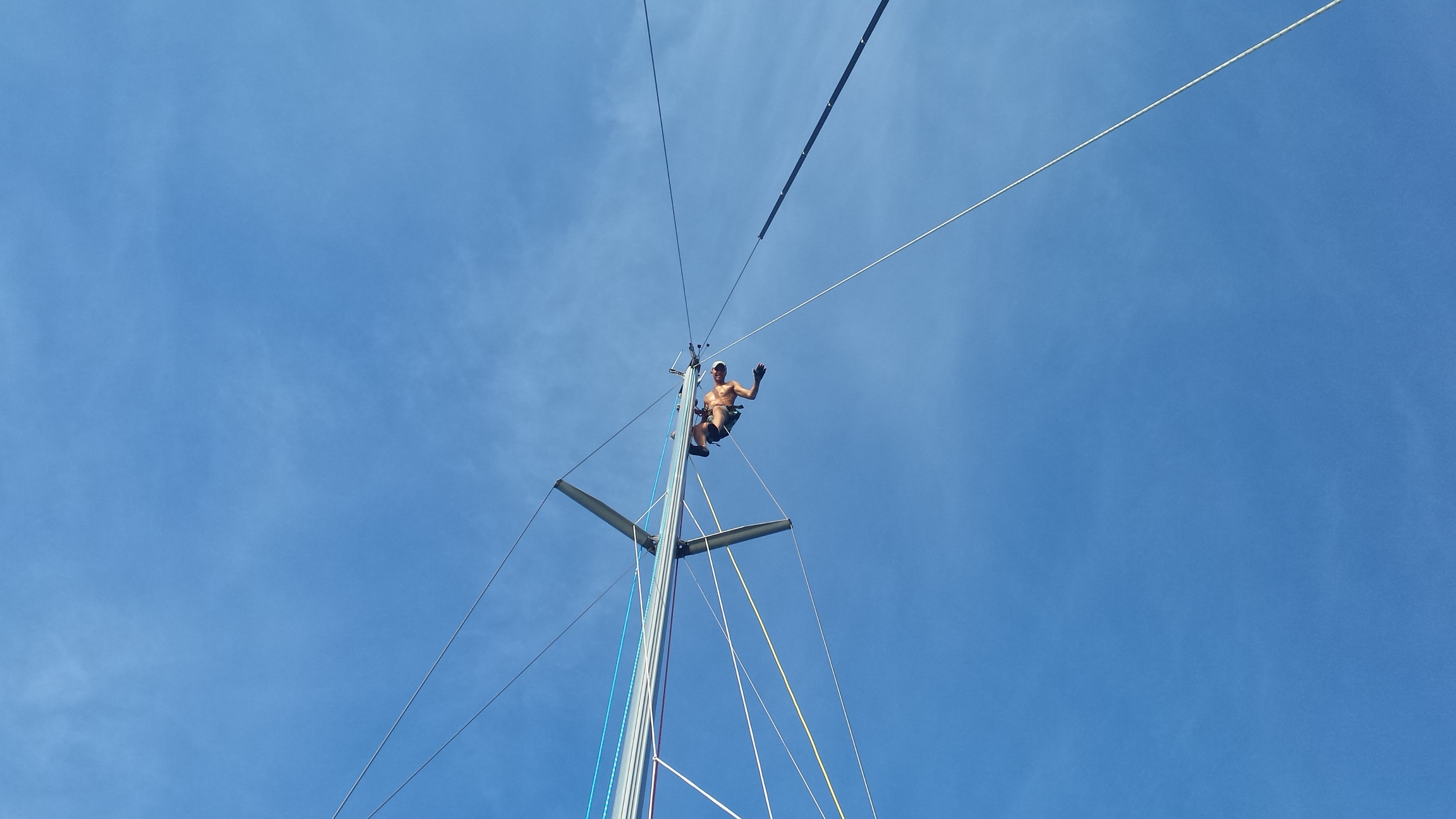 Drobne prace na maszcie. Na kotwicy trochę buja, a u góry jest to bardziej odczuwalne. Majta mną na lewo i prawo na odległość około 1 m.