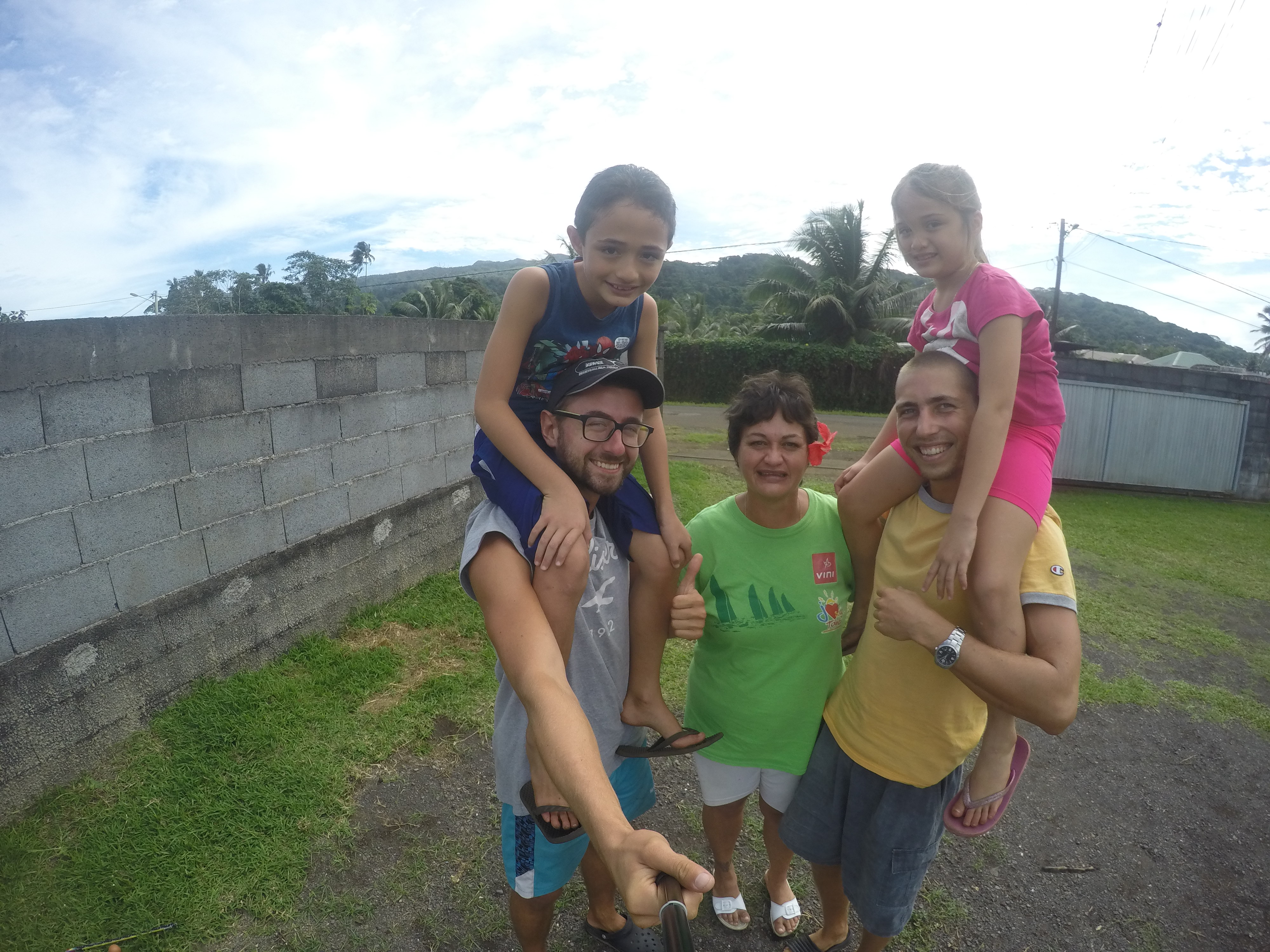Oddalając się kilkaset metrów dalej woła nas chłopak na skuterze. Widząc nas z plecakiem i słysząc, że mamy zamiar spać w namiocie, każe czekać na swoją siostrę, która ma nas zabrać do swojego domu. Nie mija 5 minut, a podjeżdża jakaś obca kobieta i także proponuje swoje miejsce. Nie chcąc czekać na siostrę, ładujemy się do samochodu i korzystamy z szybszej okazji. Domek, który służy rodzinie za miejsce spotkań weekendowych i smacznych grilli, jest naszym domem przez tę jedną noc. Właścicielka Valeriana ma tam dostęp do laguny i kajaki, z których możemy korzystać kiedy tylko zechcemy. Poznajemy jej siostrę, która przyjeżdża ze ślicznymi córkami, kuzyna, a następnego dnia także jej dzieci, które razem z nią odbieramy ze szkoły. Mam wrażenie, że jej gościnność nie ma granic. Przyjeżdżając rano do domu, przywozi nam śniadanie, zaprasza na kawę, częstuje lokalnym jedzeniem, a nawet zabiera na wycieczkę na plażę, która jest sławna z odbywających się tam turniejów surfingowych. Jej dzieci wcale nie są gorsze. Córeczka wbija do kurnika i daje nam świeże jajka (które oddajemy gdy ona nie patrzy, bo jedyne, co możemy z nimi zrobić to spaskudzić plecak), oraz swoje rysunki nad którymi pracowała w szkole. Od dziewięcioletniego Hiti Ati (czy jakoś tak… nie sposób zapamietać ich imion), którego imie oznacza walczącego wojownika, dostajemy petardy. Już tęskniąc za tą wspaniałą rodzinką i mając nadzieję na ponowne spotkanie, wracamy do Papetee, gdzie musimy pożegnać jeszcze jedną osobę – naszą kapitanową, która wskakuje w samolot i wraca do Czarnogóry.